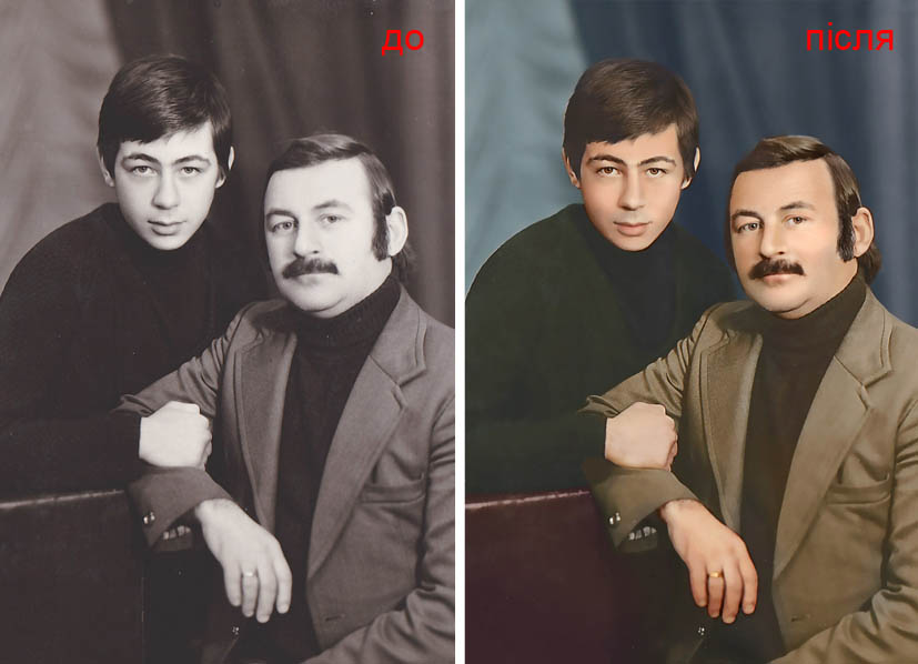 У ваших сімейних фотоархівах точно є знимки ваших бабусь і дідусів. Знимки старі, пожовклі і чорно-білі. Знимки ці не можуть передати всієї повноти життя того часу, фарб і кольорів. Приходьте до нас і ми зробимо будь-які чорно-білі фото або фото, зроблені в сепії чудовими, соковитими і кольоровими.